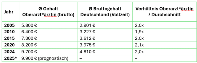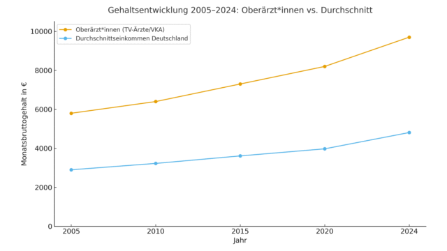 - Von 2005 bis 2024 stieg das Gehalt von Oberärzt*innen um rund 67 %, das allgemeine Durchschnittseinkommen um 66 %.